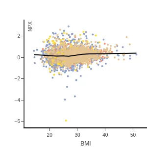 Blood protein levels by age, BMI, and sex, measured using the proximity extension assay (PEA) with the Olink Explore 1536. In the age and sex scatterplots, samples are colored by disease class.