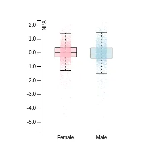 Blood protein levels in 96 healthy adults (aged 50–65) measured at six visits over a two-year period, shown separately for males and females. Relative protein abundances were quantified using the proximity extension assay (PEA) with the Olink Explore HT.