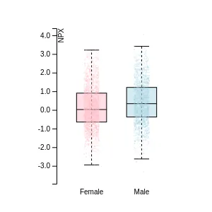 Blood protein levels in 96 healthy adults (aged 50–65) measured at six visits over a two-year period, shown separately for males and females. Relative protein abundances were quantified using the proximity extension assay (PEA) with the Olink Explore HT.