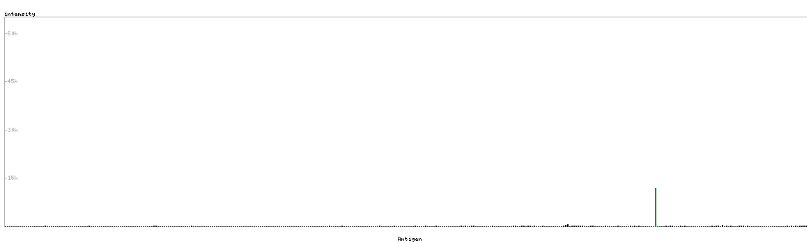 At the top of the view, the position of the antigen (identified by the corresponding HPA identifier) is shown as a green bar. A yellow triangle on the bar indicates a <100% sequence identity to the protein target.