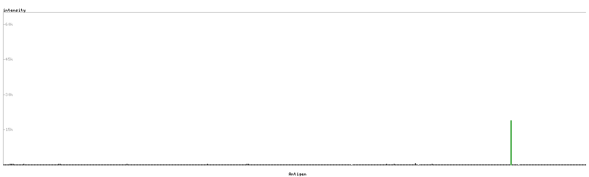 At the top of the view, the position of the antigen (identified by the corresponding HPA identifier) is shown as a green bar. A yellow triangle on the bar indicates a <100% sequence identity to the protein target.