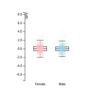 Blood protein levels in 96 healthy adults (aged 50–65) measured at six visits over a two-year period, shown separately for males and females. Relative protein abundances were quantified using the proximity extension assay (PEA) with the Olink Explore HT.