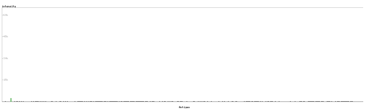 At the top of the view, the position of the antigen (identified by the corresponding HPA identifier) is shown as a green bar. A yellow triangle on the bar indicates a <100% sequence identity to the protein target.