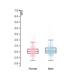 Blood protein levels in 96 healthy adults (aged 50–65) measured at six visits over a two-year period, shown separately for males and females. Relative protein abundances were quantified using the proximity extension assay (PEA) with the Olink Explore HT.