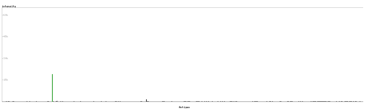 At the top of the view, the position of the antigen (identified by the corresponding HPA identifier) is shown as a green bar. A yellow triangle on the bar indicates a <100% sequence identity to the protein target.