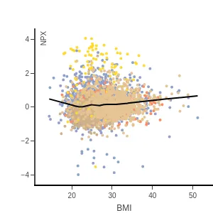 Blood protein levels by age, BMI, and sex, measured using the proximity extension assay (PEA) with the Olink Explore 1536. In the age and sex scatterplots, samples are colored by disease class.