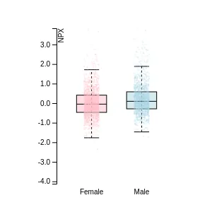 Blood protein levels in 96 healthy adults (aged 50–65) measured at six visits over a two-year period, shown separately for males and females. Relative protein abundances were quantified using the proximity extension assay (PEA) with the Olink Explore HT.