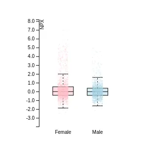 Blood protein levels in 96 healthy adults (aged 50–65) measured at six visits over a two-year period, shown separately for males and females. Relative protein abundances were quantified using the proximity extension assay (PEA) with the Olink Explore HT.