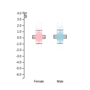 Blood protein levels in 96 healthy adults (aged 50–65) measured at six visits over a two-year period, shown separately for males and females. Relative protein abundances were quantified using the proximity extension assay (PEA) with the Olink Explore HT.