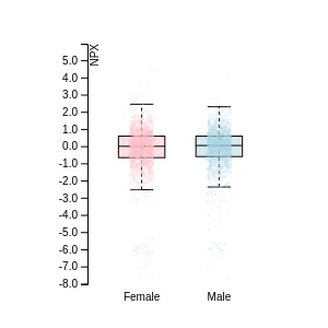 Blood protein levels in 96 healthy adults (aged 50–65) measured at six visits over a two-year period, shown separately for males and females. Relative protein abundances were quantified using the proximity extension assay (PEA) with the Olink Explore HT.