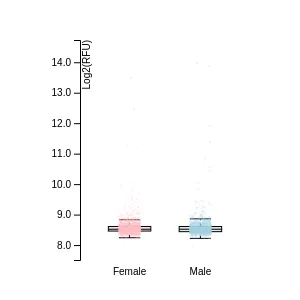 Blood protein levels in 96 healthy adults (aged 50–65) measured at six visits over a two-year period, shown separately for males and females. Relative protein abundances were quantified using the proximity extension assay (PEA) with the Olink Explore HT.