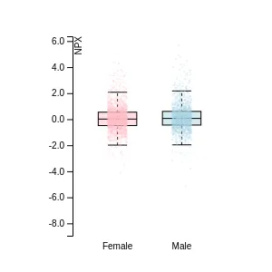 Blood protein levels in 96 healthy adults (aged 50–65) measured at six visits over a two-year period, shown separately for males and females. Relative protein abundances were quantified using the proximity extension assay (PEA) with the Olink Explore HT.