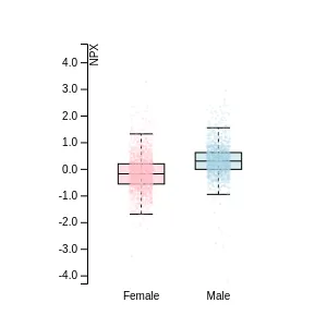 Blood protein levels in 96 healthy adults (aged 50–65) measured at six visits over a two-year period, shown separately for males and females. Relative protein abundances were quantified using the proximity extension assay (PEA) with the Olink Explore HT.
