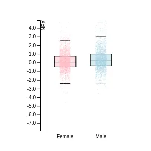 Blood protein levels in 96 healthy adults (aged 50–65) measured at six visits over a two-year period, shown separately for males and females. Relative protein abundances were quantified using the proximity extension assay (PEA) with the Olink Explore HT.