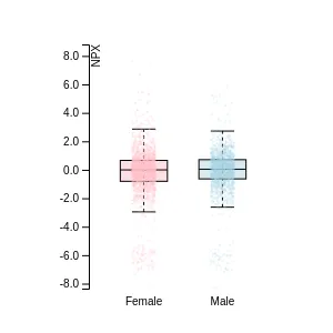 Blood protein levels in 96 healthy adults (aged 50–65) measured at six visits over a two-year period, shown separately for males and females. Relative protein abundances were quantified using the proximity extension assay (PEA) with the Olink Explore HT.