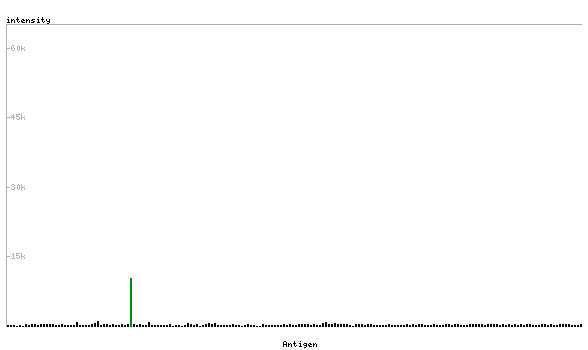 At the top of the view, the position of the antigen (identified by the corresponding HPA identifier) is shown as a green bar. A yellow triangle on the bar indicates a <100% sequence identity to the protein target.