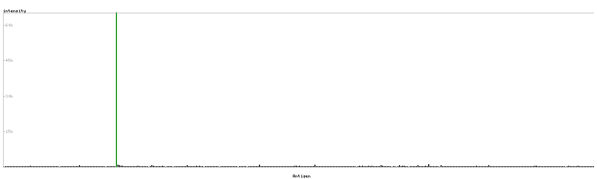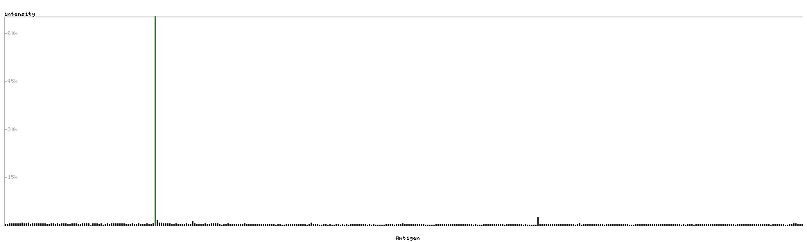 At the top of the view, the position of the antigen (identified by the corresponding HPA identifier) is shown as a green bar. A yellow triangle on the bar indicates a <100% sequence identity to the protein target.
