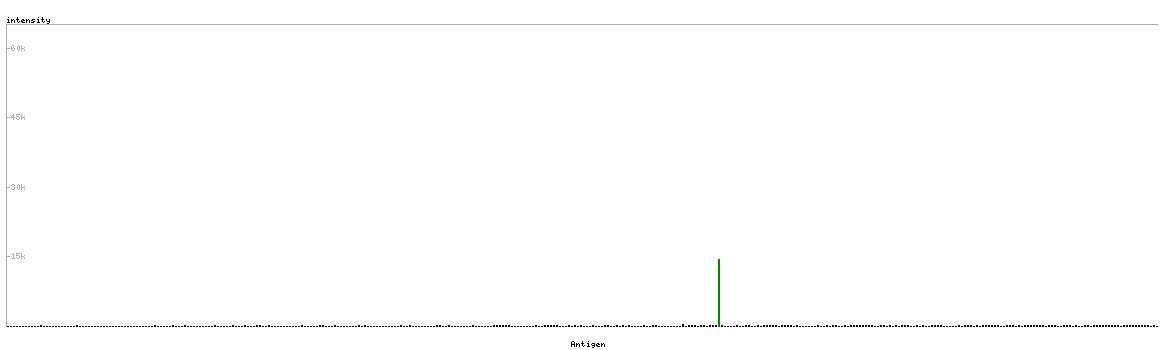 At the top of the view, the position of the antigen (identified by the corresponding HPA identifier) is shown as a green bar. A yellow triangle on the bar indicates a <100% sequence identity to the protein target.