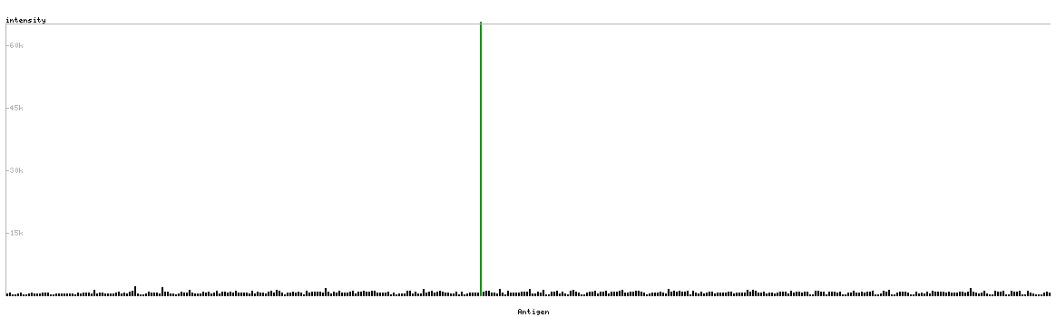 At the top of the view, the position of the antigen (identified by the corresponding HPA identifier) is shown as a green bar. A yellow triangle on the bar indicates a <100% sequence identity to the protein target.