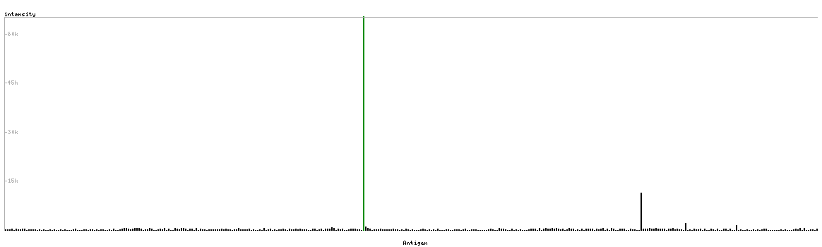 At the top of the view, the position of the antigen (identified by the corresponding HPA identifier) is shown as a green bar. A yellow triangle on the bar indicates a <100% sequence identity to the protein target.
