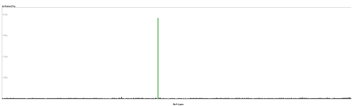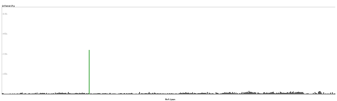 At the top of the view, the position of the antigen (identified by the corresponding HPA identifier) is shown as a green bar. A yellow triangle on the bar indicates a <100% sequence identity to the protein target.
