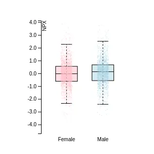 Blood protein levels in 96 healthy adults (aged 50–65) measured at six visits over a two-year period, shown separately for males and females. Relative protein abundances were quantified using the proximity extension assay (PEA) with the Olink Explore HT.