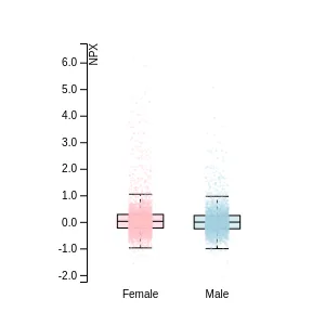 Blood protein levels in 96 healthy adults (aged 50–65) measured at six visits over a two-year period, shown separately for males and females. Relative protein abundances were quantified using the proximity extension assay (PEA) with the Olink Explore HT.