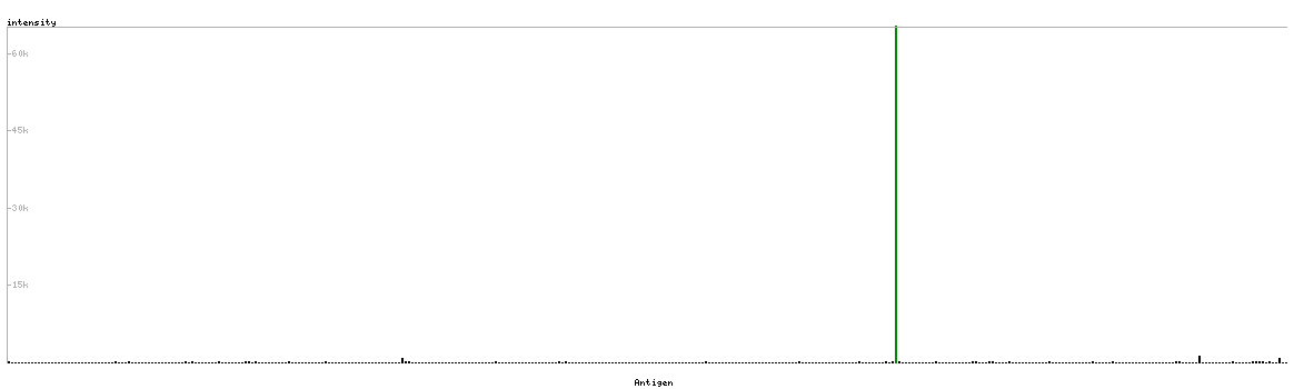 At the top of the view, the position of the antigen (identified by the corresponding HPA identifier) is shown as a green bar. A yellow triangle on the bar indicates a <100% sequence identity to the protein target.