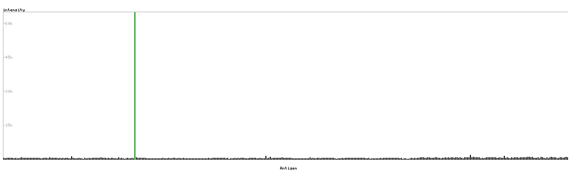 At the top of the view, the position of the antigen (identified by the corresponding HPA identifier) is shown as a green bar. A yellow triangle on the bar indicates a <100% sequence identity to the protein target.