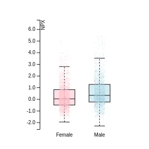 Blood protein levels in 96 healthy adults (aged 50–65) measured at six visits over a two-year period, shown separately for males and females. Relative protein abundances were quantified using the proximity extension assay (PEA) with the Olink Explore HT.