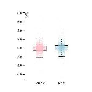 Blood protein levels in 96 healthy adults (aged 50–65) measured at six visits over a two-year period, shown separately for males and females. Relative protein abundances were quantified using the proximity extension assay (PEA) with the Olink Explore HT.