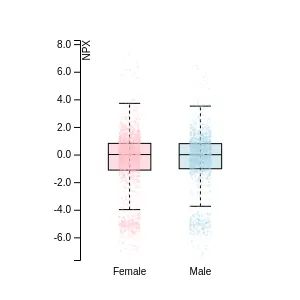 Blood protein levels in 96 healthy adults (aged 50–65) measured at six visits over a two-year period, shown separately for males and females. Relative protein abundances were quantified using the proximity extension assay (PEA) with the Olink Explore HT.