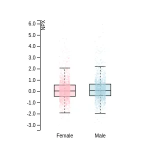 Blood protein levels in 96 healthy adults (aged 50–65) measured at six visits over a two-year period, shown separately for males and females. Relative protein abundances were quantified using the proximity extension assay (PEA) with the Olink Explore HT.