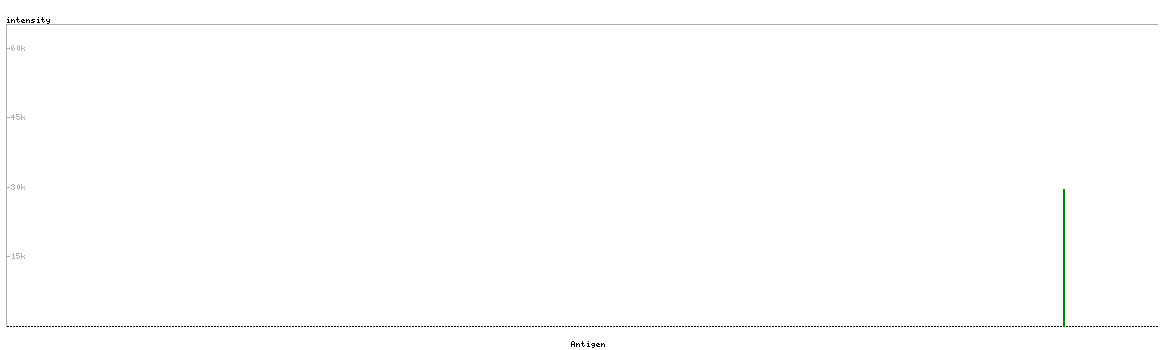 At the top of the view, the position of the antigen (identified by the corresponding HPA identifier) is shown as a green bar. A yellow triangle on the bar indicates a <100% sequence identity to the protein target.