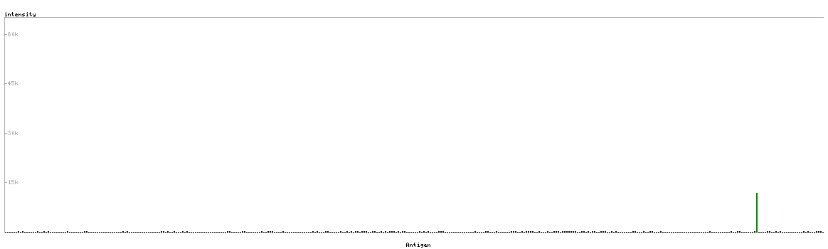 At the top of the view, the position of the antigen (identified by the corresponding HPA identifier) is shown as a green bar. A yellow triangle on the bar indicates a <100% sequence identity to the protein target.