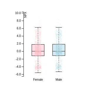 Blood protein levels in 96 healthy adults (aged 50–65) measured at six visits over a two-year period, shown separately for males and females. Relative protein abundances were quantified using the proximity extension assay (PEA) with the Olink Explore HT.