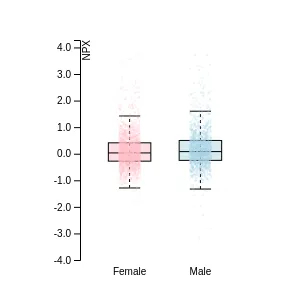 Blood protein levels in 96 healthy adults (aged 50–65) measured at six visits over a two-year period, shown separately for males and females. Relative protein abundances were quantified using the proximity extension assay (PEA) with the Olink Explore HT.