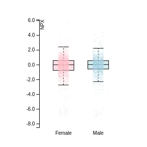 Blood protein levels in 96 healthy adults (aged 50–65) measured at six visits over a two-year period, shown separately for males and females. Relative protein abundances were quantified using the proximity extension assay (PEA) with the Olink Explore HT.