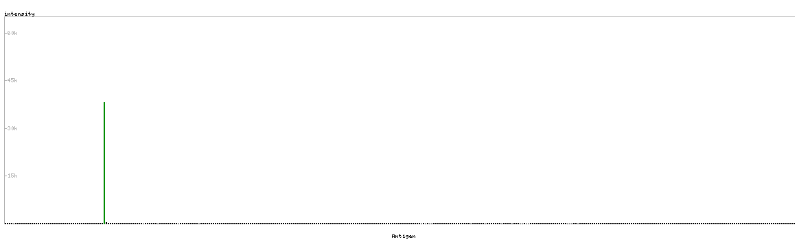At the top of the view, the position of the antigen (identified by the corresponding HPA identifier) is shown as a green bar. A yellow triangle on the bar indicates a <100% sequence identity to the protein target.
