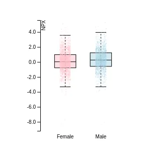 Blood protein levels in 96 healthy adults (aged 50–65) measured at six visits over a two-year period, shown separately for males and females. Relative protein abundances were quantified using the proximity extension assay (PEA) with the Olink Explore HT.