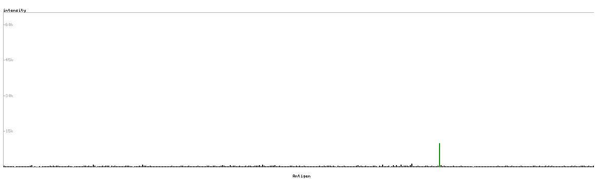 At the top of the view, the position of the antigen (identified by the corresponding HPA identifier) is shown as a green bar. A yellow triangle on the bar indicates a <100% sequence identity to the protein target.