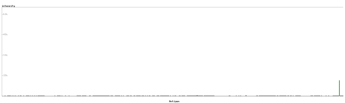 At the top of the view, the position of the antigen (identified by the corresponding HPA identifier) is shown as a green bar. A yellow triangle on the bar indicates a <100% sequence identity to the protein target.