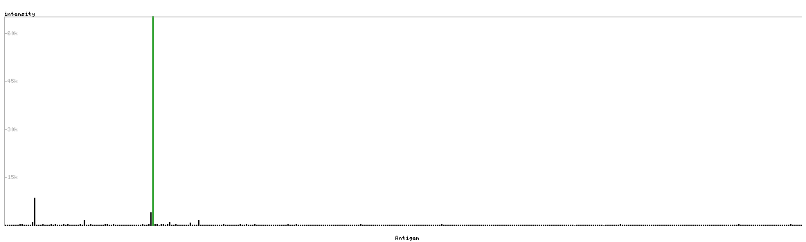 At the top of the view, the position of the antigen (identified by the corresponding HPA identifier) is shown as a green bar. A yellow triangle on the bar indicates a <100% sequence identity to the protein target.