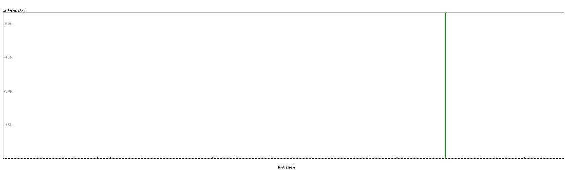 At the top of the view, the position of the antigen (identified by the corresponding HPA identifier) is shown as a green bar. A yellow triangle on the bar indicates a <100% sequence identity to the protein target.