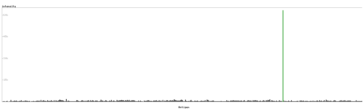 At the top of the view, the position of the antigen (identified by the corresponding HPA identifier) is shown as a green bar. A yellow triangle on the bar indicates a <100% sequence identity to the protein target.