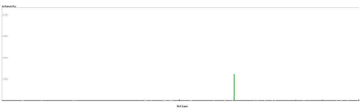 At the top of the view, the position of the antigen (identified by the corresponding HPA identifier) is shown as a green bar. A yellow triangle on the bar indicates a <100% sequence identity to the protein target.