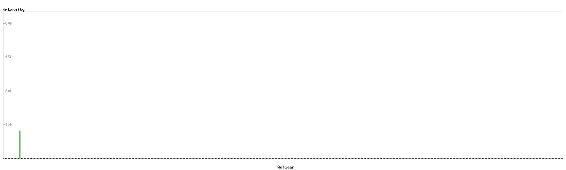 At the top of the view, the position of the antigen (identified by the corresponding HPA identifier) is shown as a green bar. A yellow triangle on the bar indicates a <100% sequence identity to the protein target.