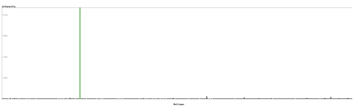 At the top of the view, the position of the antigen (identified by the corresponding HPA identifier) is shown as a green bar. A yellow triangle on the bar indicates a <100% sequence identity to the protein target.