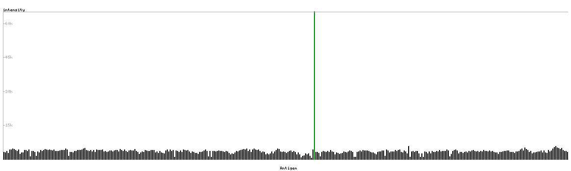 At the top of the view, the position of the antigen (identified by the corresponding HPA identifier) is shown as a green bar. A yellow triangle on the bar indicates a <100% sequence identity to the protein target.