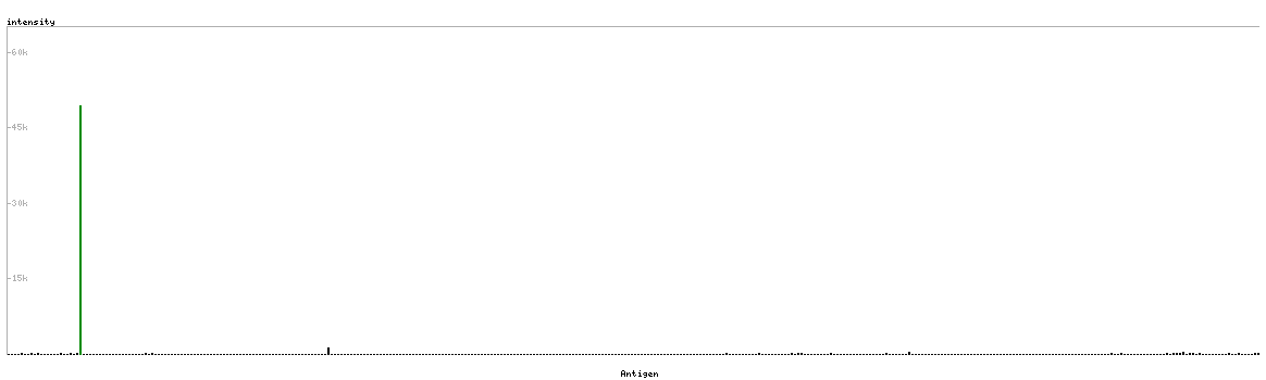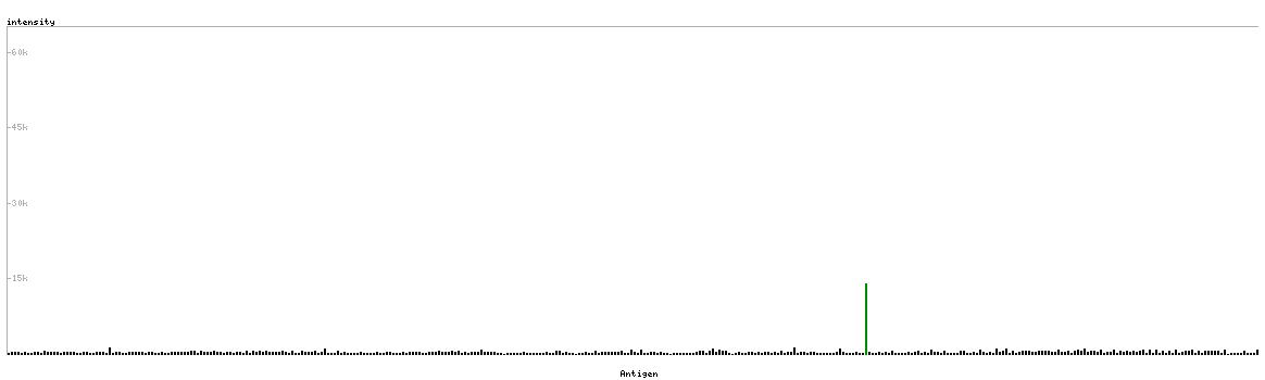At the top of the view, the position of the antigen (identified by the corresponding HPA identifier) is shown as a green bar. A yellow triangle on the bar indicates a <100% sequence identity to the protein target.